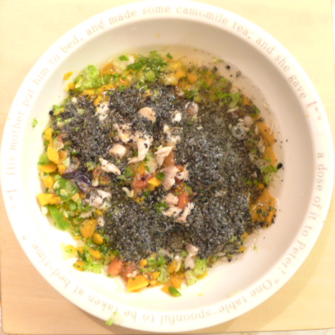 ぶり(高知養殖)7.5g 納豆2.1g ブルーベリー6g 南瓜10g きゃべつ5g ブロッコリ6g 小松菜3.5g おくら5g もやし5g トマト15g 舞茸出汁5g 昆布0.3g 黒ごま3g 湯 ebi1T bio2/3g VC0.2g Ca0.2g Zn1/8T (2~3割食べる)