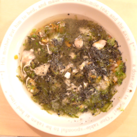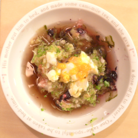 ぶり(高知養殖)7.5g 納豆2.1g 南瓜12g きゃべつ5g ブロッコリ6g 小松菜3.5g おくら5g トマト25g 舞茸出汁3.5g 昆布0.5g 黒ごま3g 小岩井10g 湯110cc ebi1T bio2/3g VC0.2g Ca0.2g Zn1/8T