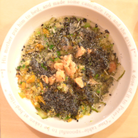 鮭7.5g さつま芋15g きゃべつ5g ブロッコリ6g もやし5g トマト14g 昆布0.2g 湯100cc 小岩井10g ebi1T ブルーベリー6g ebi1T bio2/3g VC0.2g Ca0.2g Zn1/8T