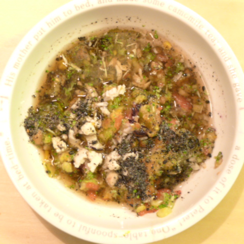 ささみ7.3g 納豆2.1g さつま芋10g 南瓜10g ブルーベリー6g きゃべつ6g ブロッコリ5g トマト12g 舞茸出汁10g 昆布0.2g 黒ごま1g 小岩井10g 湯100cc ebi1T bio2/3g VC0.1mg Ca0.2g