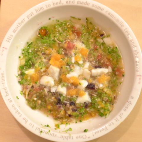 鮭7.5g さつま芋15g 南瓜5g ブルーベリー6g きゃべつ6g ブロッコリ5g おくら5g トマト20g 舞茸出汁5g 昆布0.3g 黒ごま2.5g 小岩井5g 湯100cc ebi1T bio2/3g VC0.1mg Ca0.2g zn1/8T