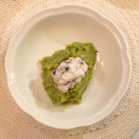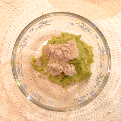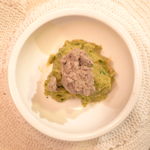 あじ(長崎)8.5g 黒豆納豆2.5g 芋15g 南瓜15g トマト30g 春きゃべつ6g ブロッコリ6g 小松菜5g スナップえんどう4g おくら6g ebi2T bio1.5g cil1g 小岩井3g あじの煮こごり amino0.3g 湯100g