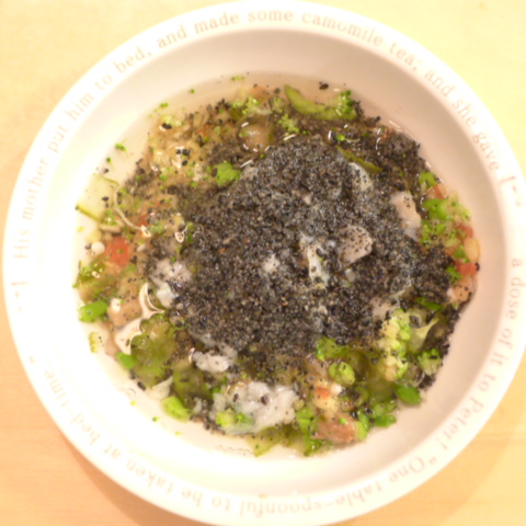 (おやつにりんご20g VC0.1g 湯20cc) 舌平目6.5g 納豆2.8g さつま芋15g ブルーベリー6g きゃべつ5g ブロッコリ5g アスパラガス5g おくら5g トマト18g 舞茸出汁3g 昆布0.3g 黒ごま2.5g 亜麻仁油0.2g 湯100cc ebi1T bio2/3g Ca0.2g のこぎりやし1cap
