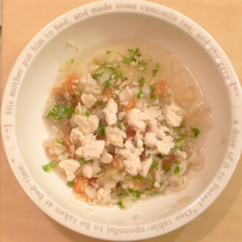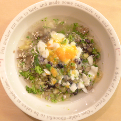 (食前にりんご20g + 湯20cc +VC0.1g ) ささみ7g 納豆2.1g 押麦12g ブルーベリー6g きゃべつ5g ブロッコリ5g もやし5g おくら6g 黒ごま1.5g 小岩井5g 湯 bio2/3g VC0.1g Ca0.2g