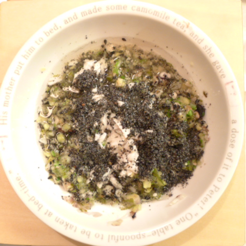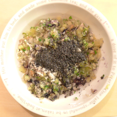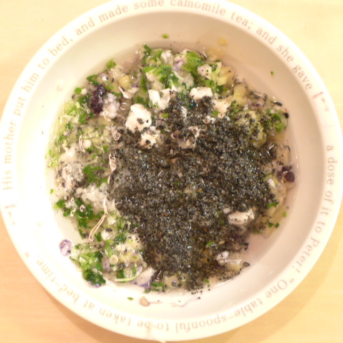 ぶり8g 納豆2.8g さつま芋20g ブルーベリー10g りんご15g きゃべつ6g ブロッコリ芽3.5g おくら6g マッシュ茸6g 昆布0.1g 小岩井10g 黒ごま3g 湯90cc ebi1T bio2/3g Ca0.2g のこぎりやし1cap