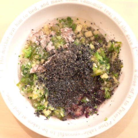 ささみ6g 納豆2.1g さつま芋15g ブルーベリー6g きゃべつ5g ブロッコリ5g もやし5g 小松菜5g 小岩井10g 亜麻仁油1g 湯80cc ebi1T bio2/3g VC0.2g Ca0.2g Zn1/8T のこぎりやし1cap