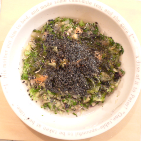 鮭7g 納豆2.1g さつま芋15g ブルーベリー6g きゃべつ5g ブロッコリ4g もやし5g 小松菜5g おくら5g 昆布0.1g 黒ごま3g 小岩井10g 湯130cc bio2/3g VC0.2g Ca0.2g のこぎりやし1cap