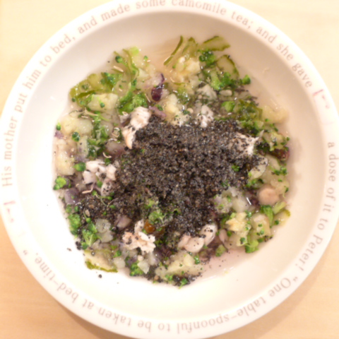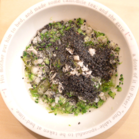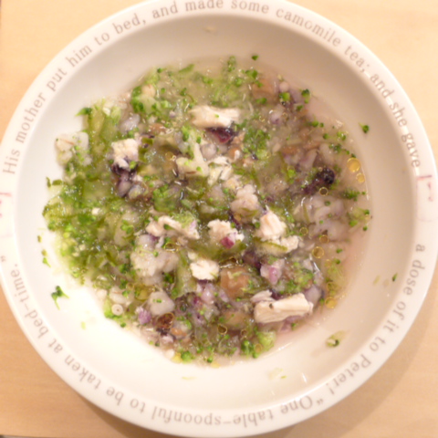 ぶり7g じゃがいも15g ブルーベリー6g きゃべつ5g ブロッコリ5g おくら5g 小松菜6g 昆布0.05g 黒ごま3g 小岩井10g 湯80cc ebi1T bio2/3g VC0.2g Ca0.2g のこぎりやし1cap