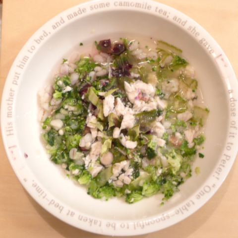 ささみ6g 納豆2.1g 押麦11g きゃべつ5g ブロッコリ5g もやし5g おくら5g 亜麻仁油0.5g 小岩井10g 湯100cc ebi1T bio2/3g VC0.2g Ca0.2g のこぎりやし1cap