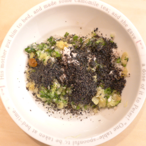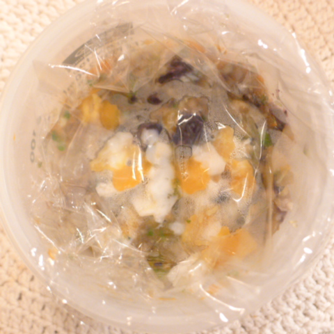 鮭7g さつま芋15g ブルーベリー6g きゃべつ5g もやし7g 人参8g おくら5g 小岩井10g 湯100cc ebi1T bio2/3g VC0.3g Ca0.2g のこぎりやし1cap