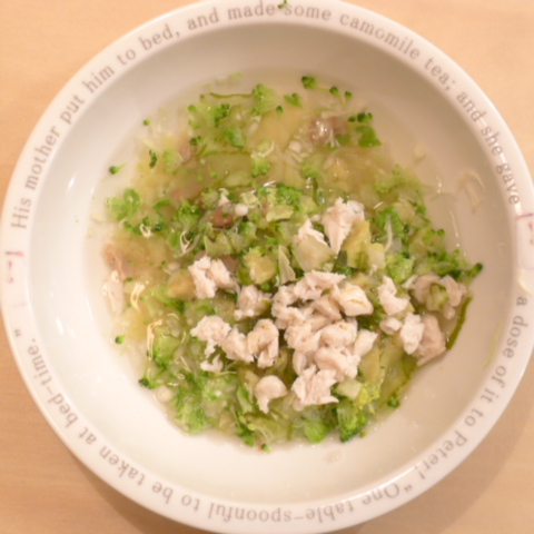 ささみ6g 豆腐10g さつま芋15g ブルーベリー6g きゃべつ6g ブロッコリ5g もやし5g おくら5g 亜麻仁油1g 小岩井10g 湯80cc ebi1T bio2/3g VC0.2g Ca0.2g のこぎりやし1cap