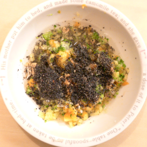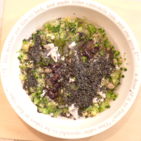 さわら7g 豆腐8.5g さつま芋13.5g ブルーベリー6g きゃべつ5g ブロッコリ5g もやし5g 小松菜5g おくら5g 昆布0.05g 黒ごま3g 小岩井10g 湯100cc ebi1T bio2/3g VC0.3g Ca0.2g のこぎりやし1cap