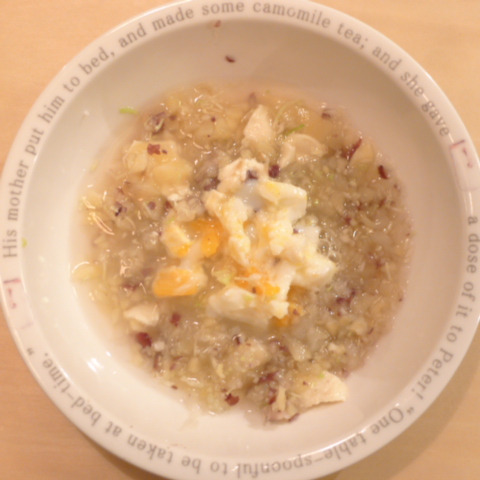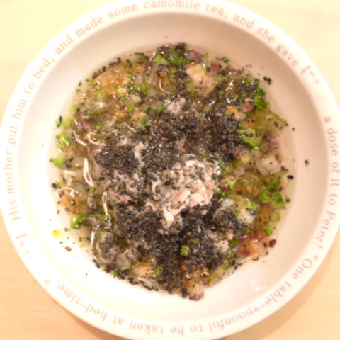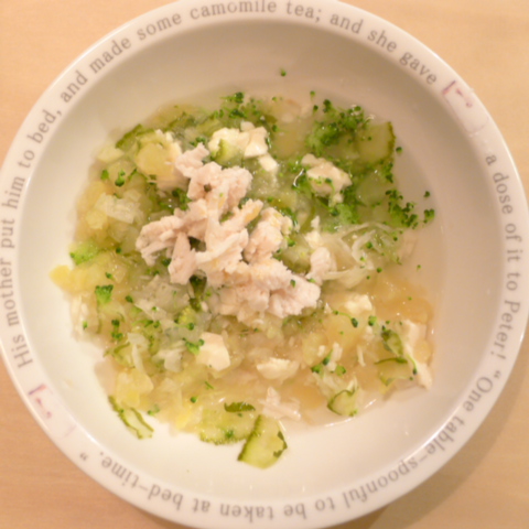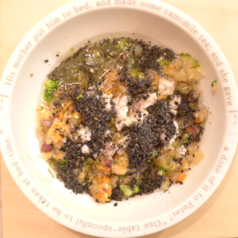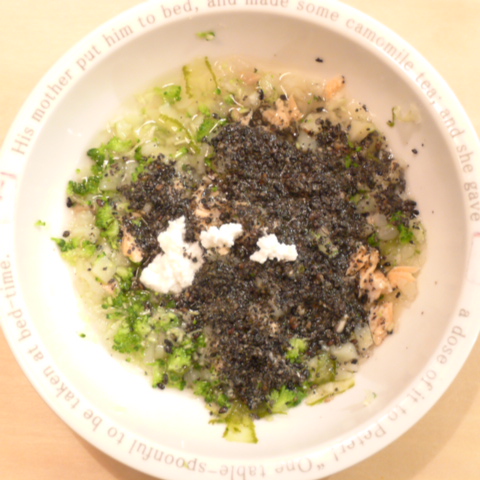 鮭7g 豆腐10g じゃが芋15g きゃべつ5g ブロッコリ5g もやし5g 昆布0.05g 黒ごま3g 小岩井20g 湯80cc bio2/3g VC0.2g Ca0.2g Zn1/10T のこぎりやし1cap