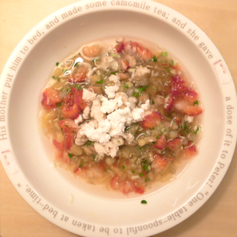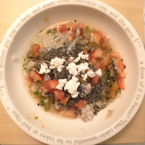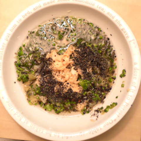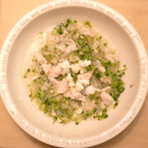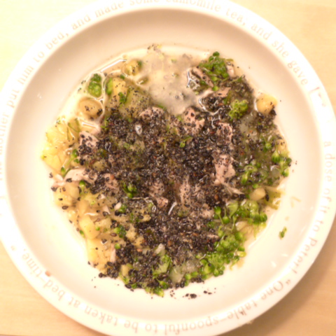 鰯7g 押麦10g きゃべつ5g ブロッコリ5g 人参10g 舞茸出汁10g 昆布0.05g 黒ごま3g カッテージ3g 小岩井20g ebi1T bio2/3g VC0.2g Ca0.2g のこぎりやし1cap