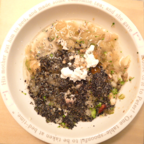 半熟卵10g(卵白6.5g 卵黄3.5g) 押麦15g 苺8g きゃべつ5g ブロッコリ5g もやし5g マッシュ茸10g(茸5g 出汁5g) 昆布0.1g 亜麻仁油1g 小岩井20g 湯80cc