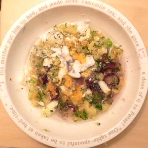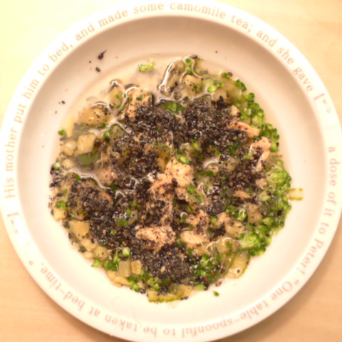 あじ8g 豆腐10g 芋15g きゃべつ5g ブロッコリ5g 小松菜5g 人参5g マッシュ茸6g 昆布0.05g 黒ごま3g 小岩井20g 湯100cc りんご20g bio2/3g