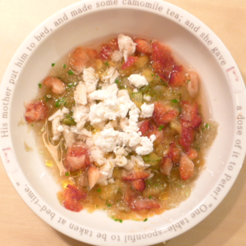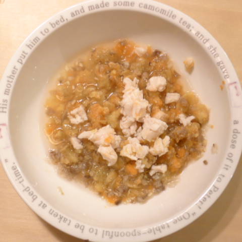 卵12g(卵白8g 卵黄4g)芋15g きゃべつ5g ブロッコリ芽5g 舞茸出汁10g 苺6g 昆布0.05g カッテージ3.5g 小岩井20g 湯40cc ebi1T bio2/3g VC0.2g Ca0.2g