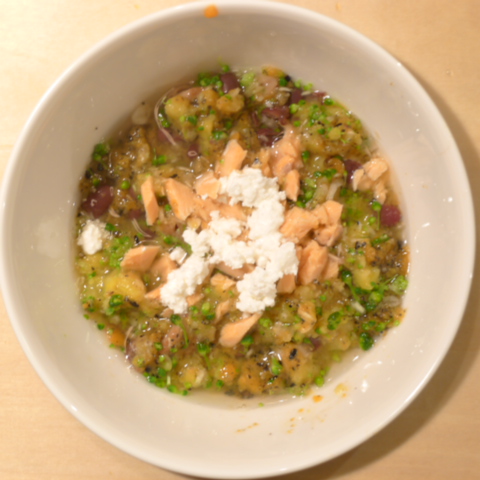 鮭7g 豆腐10g 安納芋15g きゃべつ5g ブロッコリ5g 小松菜5g もやし5g 昆布0.05g 黒ごま2.5g 小岩井20g カッテージ3g ebi1T bio2/3g VC0.2g Ca0.2g