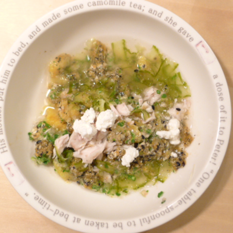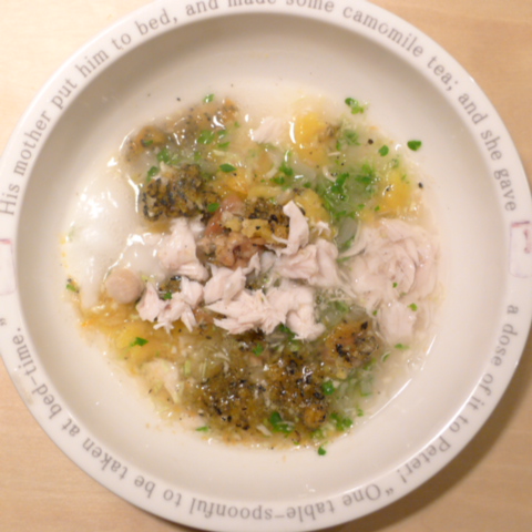 ぶり7g 豆腐10g 安納芋15g きゃべつ5g ブロッコリ芽5g 人参10g 黒ごま2.5g 昆布0.05g カッテージ3g 小岩井20g ebi1T bio2/3g VC0.2g Ca0.2g