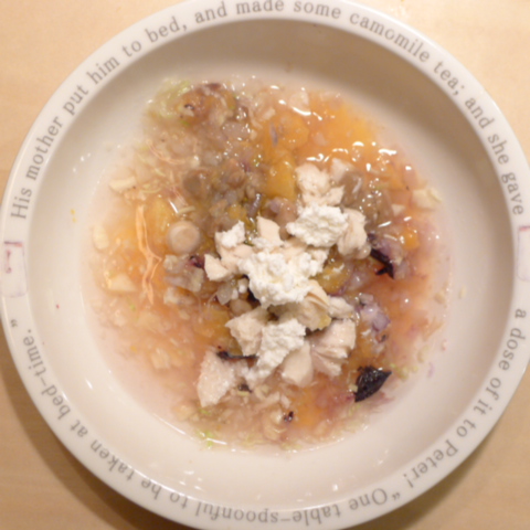 ささみ6g 豆腐10g 小豆3.5g 安納芋15g きゃべつ5g ブロッコリ芽5g もやし5g 昆布0.05g 亜麻仁油0.5g カッテージ3g 小岩井20g 湯60cc ebi1T bio2/3g VC0.2g Ca0.2g のこぎり1T
