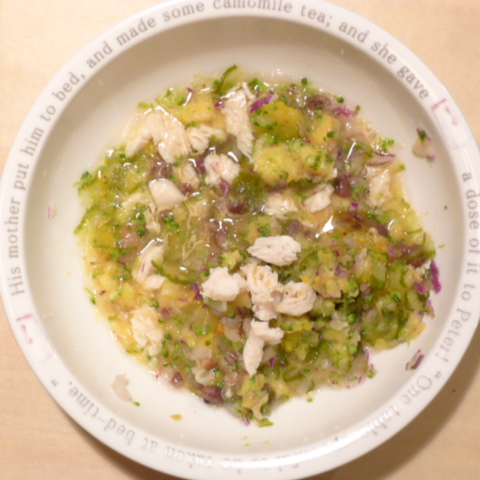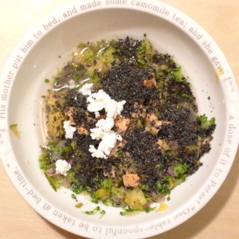 鮭7.5g 豆腐10g(おやつに別皿で) 安納芋15g 紫きゃべつ5g ブロッコリ5g もやし5g 南瓜6g 舞茸出汁5g 昆布0.1g 黒ごま3g カッテージ3g 小岩井20g ebi1T bio2/3g VC0.2g Ca0.2g のこぎりやし1cap