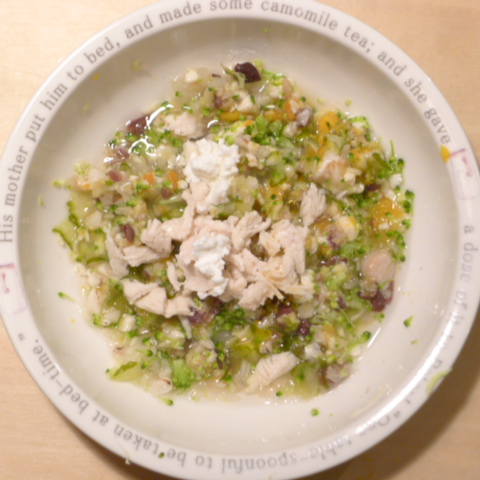 ささみ6g 納豆2.1g じゃが芋15g きゃべつ5g 舞茸10g ブロッコリ5g 南瓜8g 昆布0.1g 亜麻仁油1g カッテージ1.5g 小岩井20g 湯50cc ebi1T bio2/3g VC0.2g Ca0.2g
