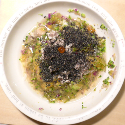 あじ8g 納豆2.1g 安納芋15g きゃべつ5g ブロッコリ6g もやし5g 南瓜8g 昆布0.1g 黒ごま2.5g 湯70cc 小岩井20g ebi1T bio2/3g VC0.2g Ca0.2g