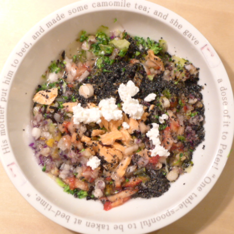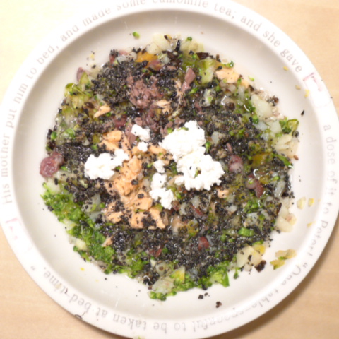 鮭5g ぶり2g 小豆5g 納豆3.5g じゃがいも15g きゃべつ5g ブロッコリ5g もやし5g 南瓜8g 茹ひじき5g 昆布0.1g 黒ごま3g カッテージ3g 小岩井20g 湯80cc ebi1T bio2/3g VC0.2g Ca0.2g のこぎりやし1cap