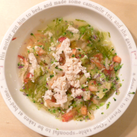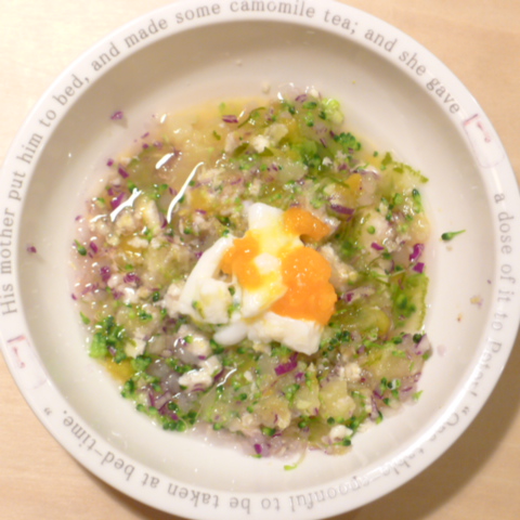 ささみ7.5g 卵黄2g 納豆3.5g 紅はるか15g 苺15g 紫きゃべつ5g ブロッコリ5g マッシュ茸8g 南瓜8g 昆布0.1g 亜麻仁油1g 小岩井20g カッテージ3g 湯20cc ebi1T bio2/3g VC0.2g Ca0.2g Zn1/10T