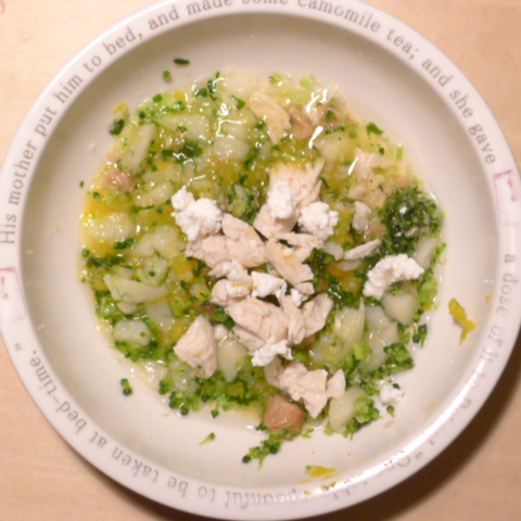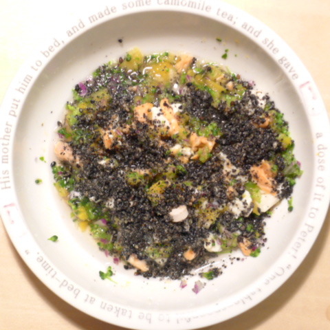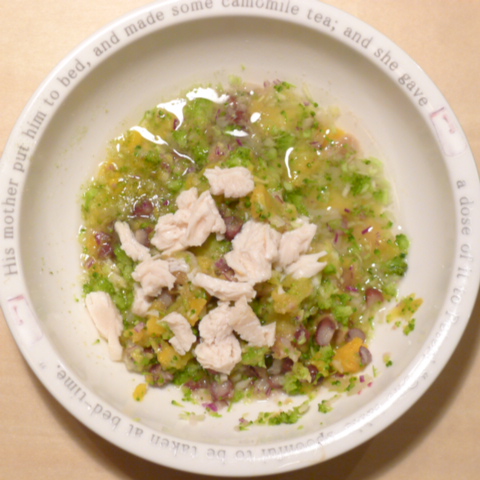 鮭8g 豆腐10g 安納芋15g 紫きゃべつ6g ブロッコリ5g 小松菜5g 南瓜8g 舞茸の出汁2g 黒ごま3g カッテージ3g小岩井20g 湯50cc ebi1T bio1g VC0.3g Ca0.2g