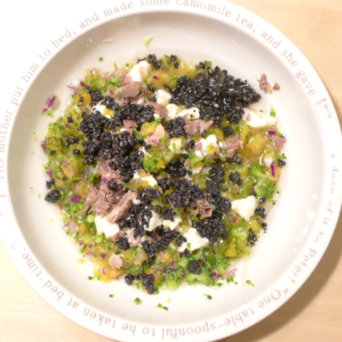 ささみ7g 豆腐10g 安納芋15g 紫きゃべつ5g ブロッコリ5g 小松菜5g 南瓜10g 昆布0.1g 亜麻仁油1g カッテージ5g 小岩井20g 湯80cc ebi1T bio2/3g VC0.2g Ca0.2g