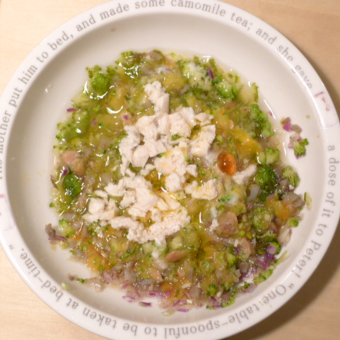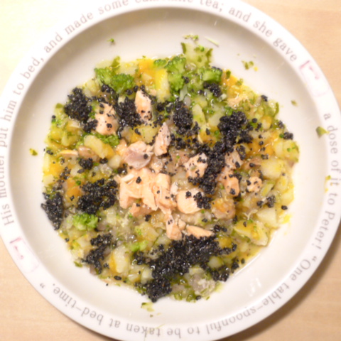 鶏(ムネ、モモ)6.5g 豆腐10g 安納芋15g きゃべつ5g ブロッコリ5g もやし5g 南瓜8g 舞茸5g 亜麻仁油1g ダノン20g 湯60cc ebi1T bio1g VC0.3g Ca0.2g