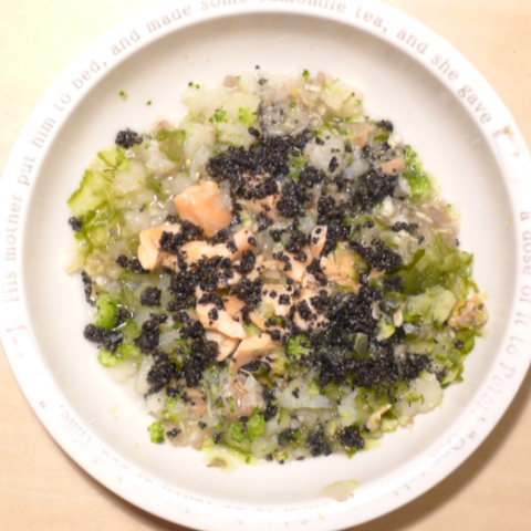 ささみ6.5g 納豆3.5g 安納芋15g きゃべつ5g ブロッコリ5g 舞茸5g 南瓜8g 昆布0.1g 亜麻仁油0.5g ダノン20g 湯80cc ebi1T bio1g VC0.2g Ca0.2g のこぎりやし1cap