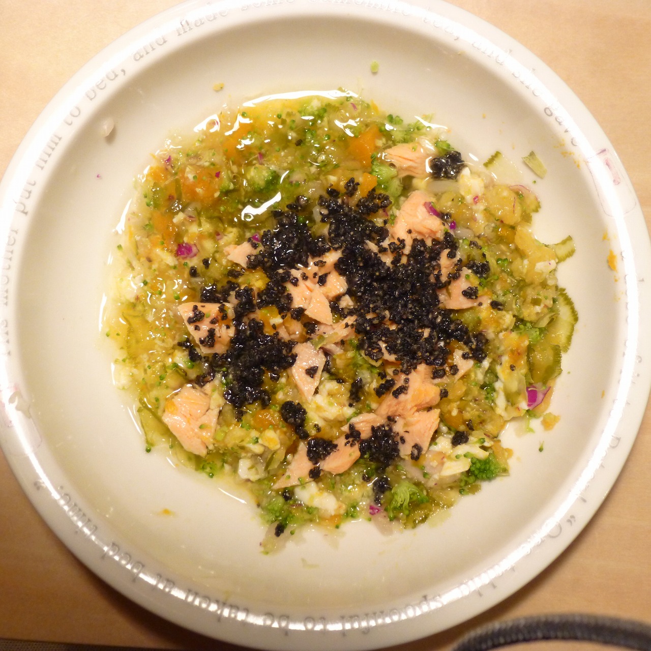鮭7.5g 豆腐10g 安納芋8g きゃべつ6g ブロッコリ3.5g もやし5g 南瓜8g 昆布0.2g 黒ごま2g 小岩井10g ebi1T bio1g VCE0.3g Ca0.15g