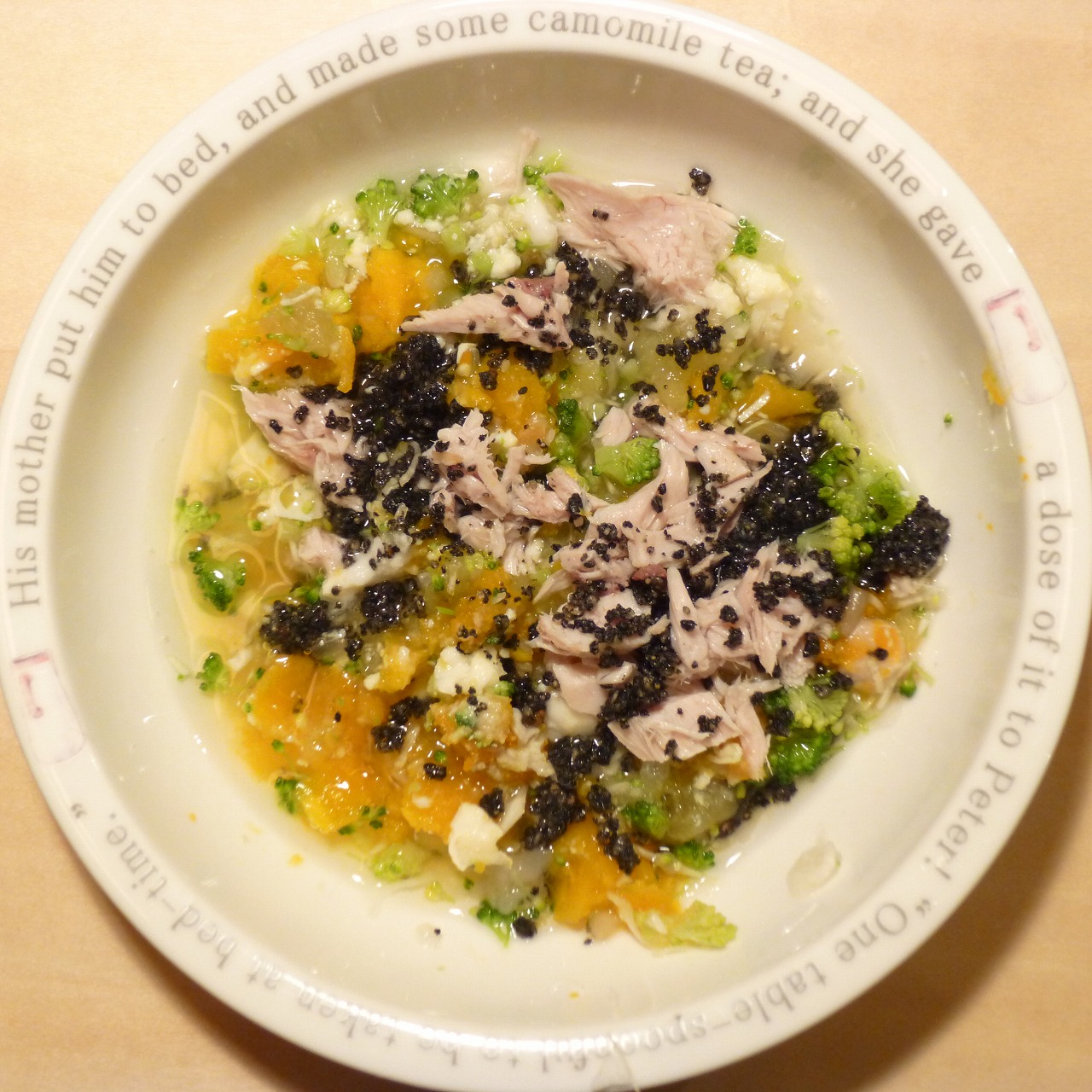 ぶり7g 豆腐10g 納豆3.5g 蜜芋10g きゃべつ6g ブロッコリ5g もやし6g 人参10g 昆布1g 黒ごま3g 小岩井20g ブルーベリー3g 湯60cc ebi1T bio1g VC0.2g
