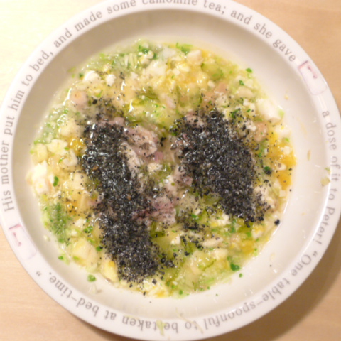かわはぎ8g 豆腐15g 納豆3.5g 黒豆3.5g 小豆6g きゃべつ5.5g ブロッコリ芽5g もやし6g 南瓜11g 昆布1g 黒ごま2g カッテージ5g ダノン20g ebi1T bio3g VC0.2g Ca0.2g