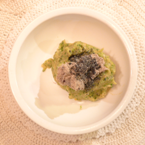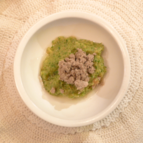 鯛(長崎天然)8g 黒豆納豆3g 芋16g 南瓜11g トマト24g 春きゃべつ5g ブロッコリ5g 小松菜5g スナップえんどう5g おくら(いぶすき)5g 黒ごま1g 亜麻仁油0.2g ebi2T bio1.5g EsC0.4g Cilantro1g 俊粉1g 湯70g