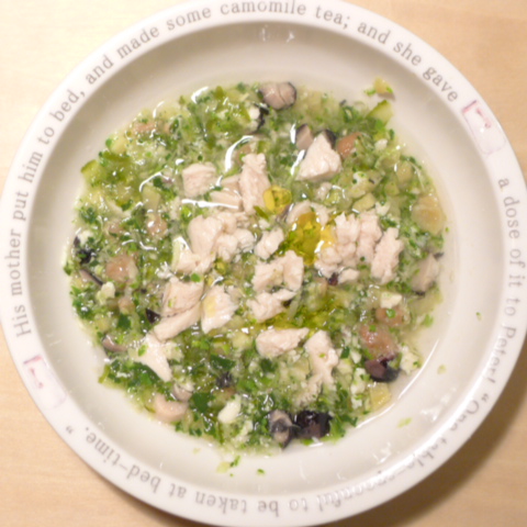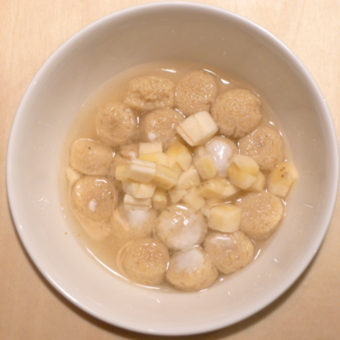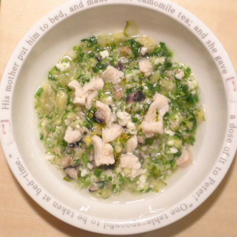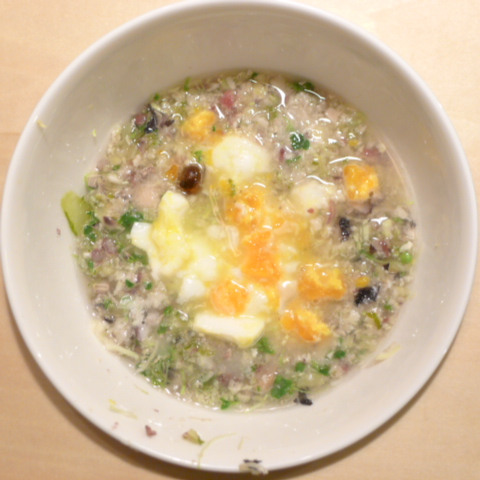 半熟卵10g ささみ7g 豆腐10g 黒豆5g 納豆3.5g さつま芋10g きゃべつ5g ブロッコリ芽5g 小松菜6g 昆布1g 亜麻仁油1g ダノン5g ebi1T bio3g VC0.2g
