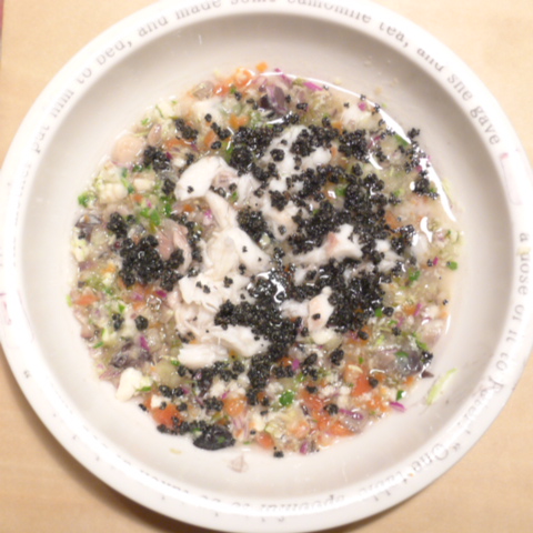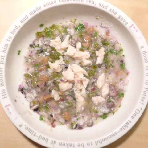 ぶり5g 鮭3.5g 黒豆6g 納豆3.5g (鳴門金時10gご飯の前に食べる)蜜芋10g 麩0.1g きゃべつ5.5g ブロッコリスプラウト5g 金時人参15g 昆布1g りんご15g 黒ごま3g ebi1T bio3g VC0.2g のこぎりやし1cap