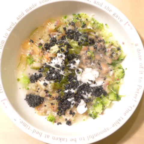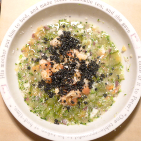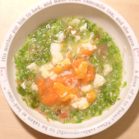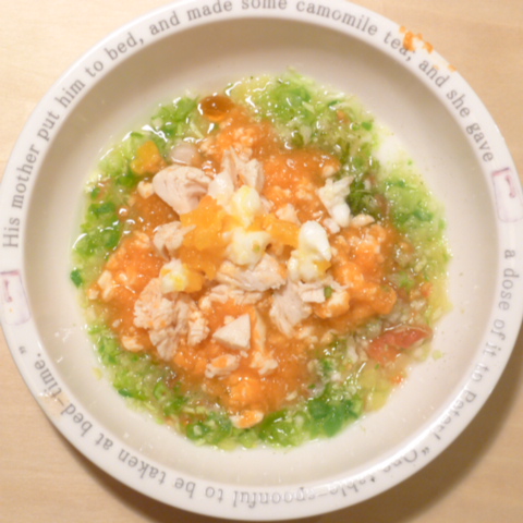 夕ご飯 ささみ6.5g 豆腐10g 芋10g きゃべつ6g ブロッコリ7g 三度豆5g ピーマン5g プチトマト5g 昆布1g 亜麻仁油1g ダノン20g ebi1T bio3g VC0.1g Ca0.1g