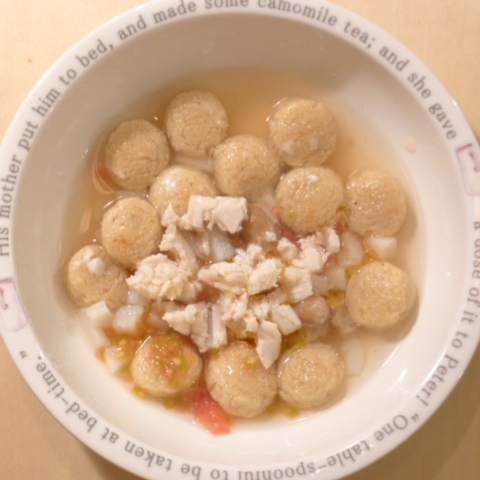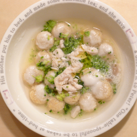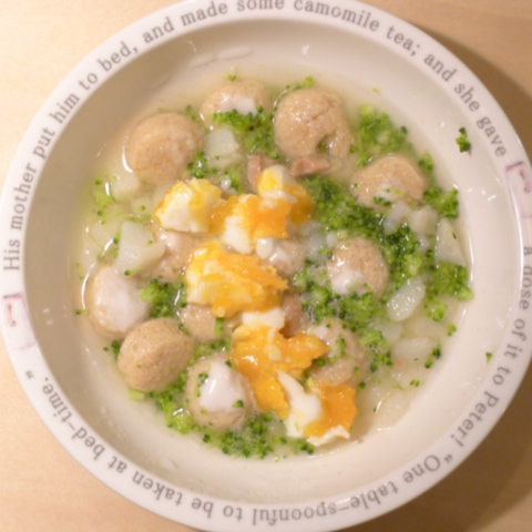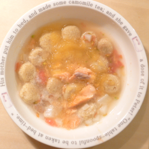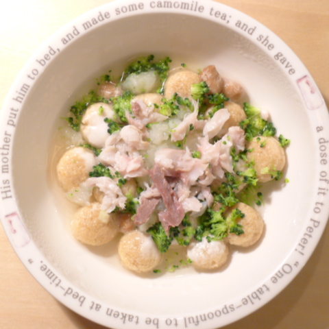 h/d10.2g 湯70cc 鮭6.5g 納豆3.5g ブロッコリ6g じゃがいも10g ブロッコリ5g 亜麻仁油0.5g ダノン10g eb1T bio3g Vc0.5g Ca0.15g のこぎりやし1個