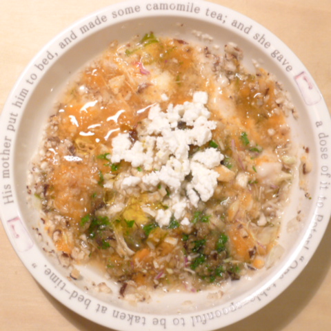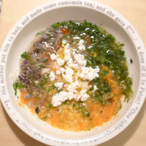 鮭8g さつま芋8g きゃべつ8g ブロッコリ8.5g 茄子8g プチトマト8g 舞茸5g+出汁6g 昆布0.5g 黒ごま3g カッテージ3g 小岩井20g ebi1T bio2g Vc0.5g Ca0.3g Zn0.1 のこぎりやし1T