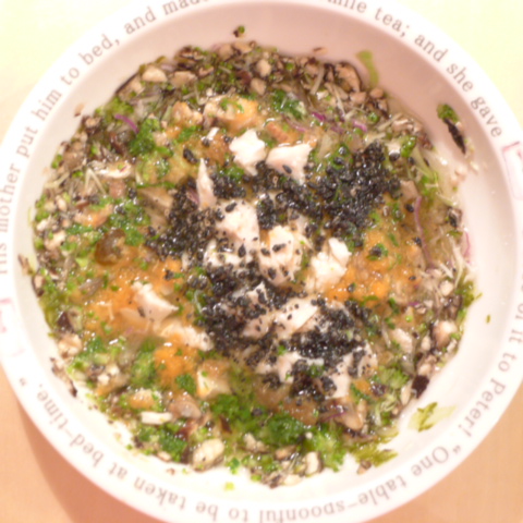 びんながまぐろ10g 納豆2.5g さつま芋6g きゃべつ5g ブロッコリ5g 紫蘇1g 人参8g プチトマト10g 昆布0.3g マッシュルーム5g 干椎茸1g 黒ごま3g 小岩井20g ebi1T bio2g Vc0.2g Ca0.2g のこぎりやし1T