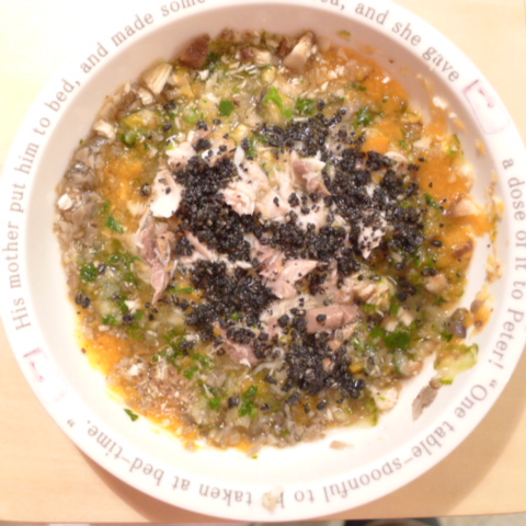さんま20g(追加で食べた) さつま芋7.5g 小松菜5g きゃべつ5g 茄子5g 人参10g 舞茸5g 干椎茸1.8g 昆布0.5g 黒ごま3g 小岩井20g ebi1T bio2g Vc0.2g VcE1/2包 Ca0.2g Zn0.1 のこぎりやし1T
