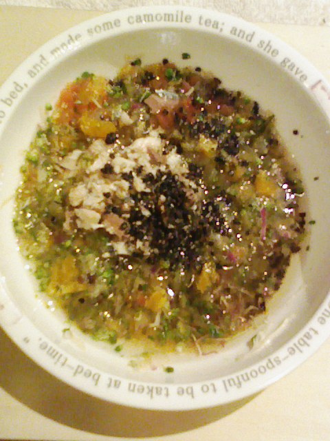 さんま8g ブロッコリ5g なす8g 紫蘇1g 中トマト15g マッシュ茸の出汁8g 昆布0.3g ひじき0.5g 黒ごま3g みかん10g 湯80cc 小岩井30g ebi1T bio2g Vc0.2g Ca0.15g Zn1/10