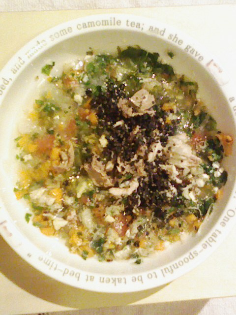 さんま8g 納豆5g 小松菜10g キャベツ5.5g 大根10g 紫蘇2g 人参9g プチトマト15g 干椎茸1g さつま芋8g 昆布0.3g 黒ごま3g 湯100cc 小岩井20g ebi1錠 bio2g Vc0.2g Zn1/10 のこぎりやし