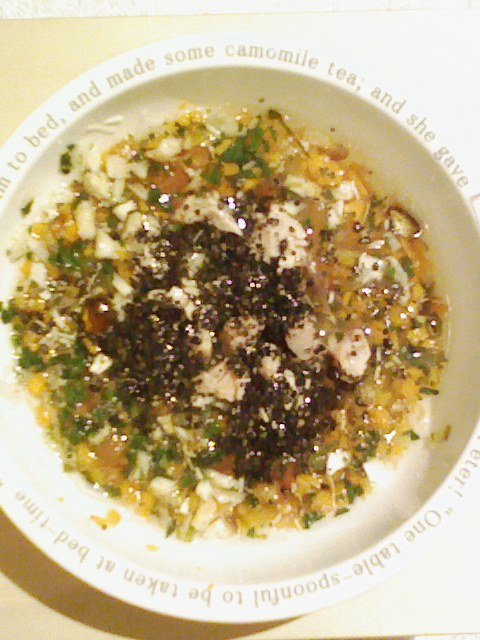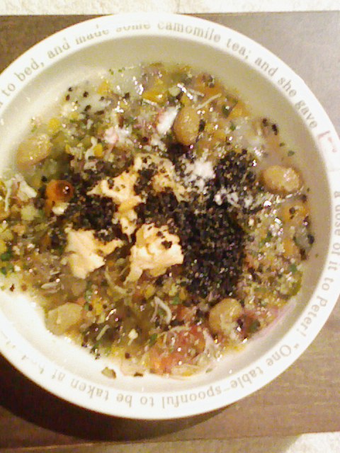 鮭8g 納豆3.5g キャベツ5g なす10g 紫蘇2g 中トマト20g マッシュ茸8g 干椎茸1g 鳴門金時8g 昆布0.3g 黒ごま3g 湯80cc 小岩井20g ebi1T bio2g Vc0.2g Ca0.15g Zn1/10