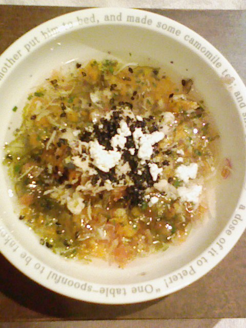 さんま8g キャベツ5g なす8g 紫蘇1.3g 中トマト20g 昆布0.3g 黒ごま3g 湯80cc カッテージ2g 小岩井20g ebi1T bio2g Vc0.2g Ca0.15g Zn1/10 (おやつに鳴門金時6g 鹿肉五膳1g)