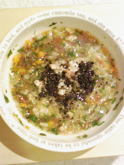 あじ8g 納豆3.5g 紫キャベツ5g 大根5g 紫蘇2g なす5.5g 人参5.5g プチトマト20g マッシュ茸6g さつま芋5g 黒ごま3g 湯70cc 小岩井20g すいか25gebi bio2g VC0.2g Ca0.15g Zn1/10 のこぎりやしamino1/2