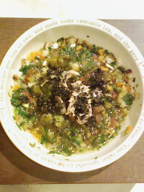 ささみ6g 納豆3.5g キャベツ5g 紫蘇1.8g なす6g 人参10g プチトマト13g 舞茸5g さつま芋7g 昆布0.3g ひじき1g 亜麻仁油1g 湯100cc カッテージ3g 小岩井20g ebi bio2g Vc0.2g Ca0.15g Zn1/10 のこぎりやし